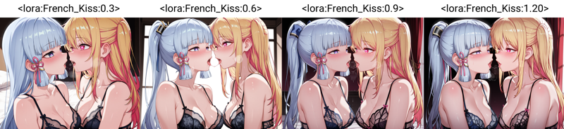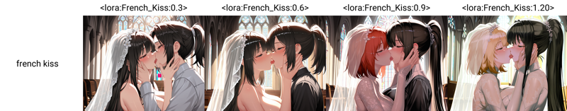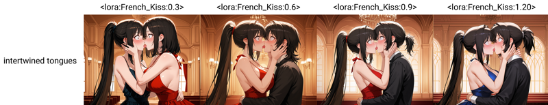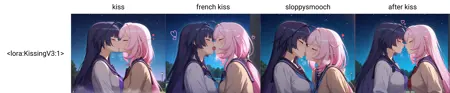 Concept LoRA that manipulates image output for kissing actions. Reference the sample pictures in the showcase for examples of how the output changes.