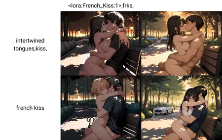 키스 동작에 대한 이미지 출력을 조절하는 개념 LoRA입니다. 출력이 어떻게 변하는지 보려면 쇼케이스의 샘플 이미지를 참조하세요.