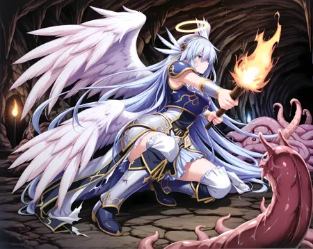 base outfit, armor, armored dress, breastplate, pauldrons, vambraces, skirt, armored boots, hairband, feather hair ornament,