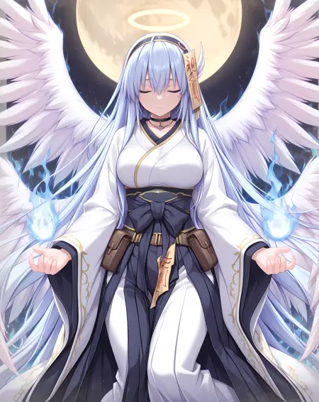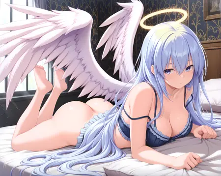 blue hair, very long hair, hair between eyes, feather hair ornament