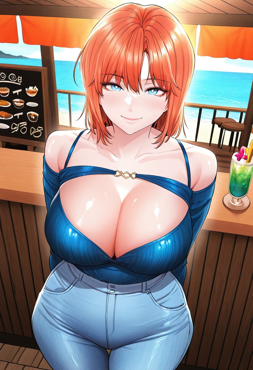 이루리: lee_ru-ri, 날카로운 파란 눈, 아름다운 주황색 머리카락, 아름다운 짧은 볼륨 헤어, 앞머리, 거대하고 허름한 가슴,