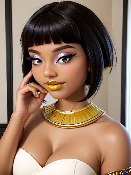 ifta,1girl, tan, black hair, tendril, big breasts, short bob cut, yellow hair tips, straight hair, oftas_hairstyle:1.4,