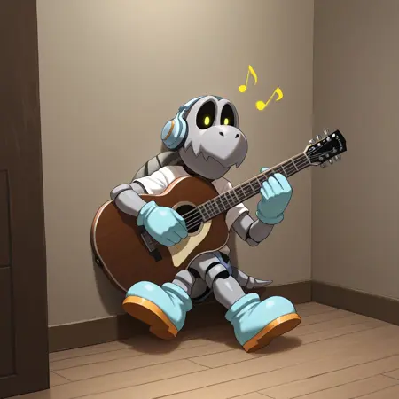 使用的标签: 男性,骨架,有壳,灰色外壳,短尾巴,黑色眼白,黄色瞳孔,浅蓝色手套,浅蓝色鞋子