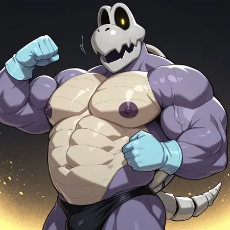 “Himbones”版本: 骨架头,男性,有壳,灰色外壳,短骨架尾巴,黑色眼白,黄色瞳孔,浅蓝色手套,浅蓝色鞋子,barazoku,肌肉发达,大肌肉,大胸肌,紫色皮肤,米色渐变躯干,深紫色乳头