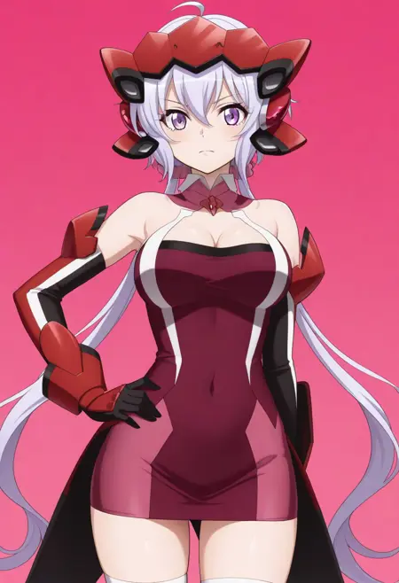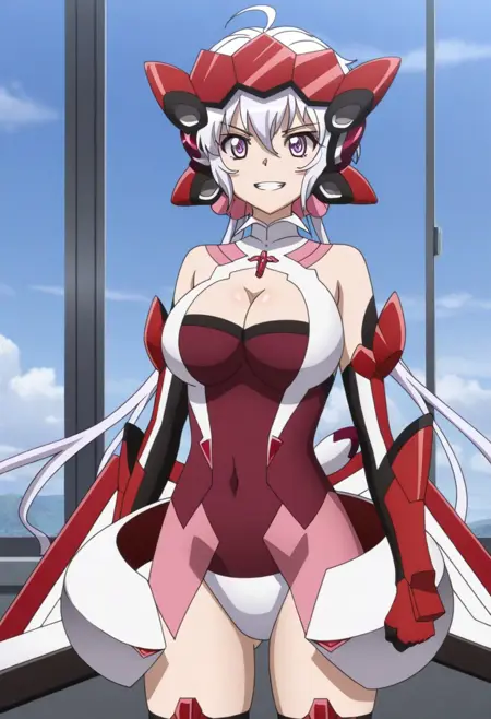 1girl, solo, SymphoKoorisu, white hair, fluffy hair, hair between eyes, purple eyes, low twintails, pink hair scrunchies, red symphogear necklace, cleavage, red and black Icha_headgear, red and white icha_bow with black trim, white icha_collar, bare shoulders, white icha_upper_shirt, pink and black icha_inner_leotard, white leotard crotch, pink icha_waistcape, red and black icha_elbow_gloves with white trim, red and black icha_gauntlets, white and red icha_thighhighs with black trim, red icha_slippers with red bows