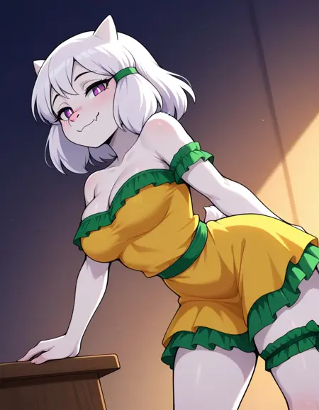 angelUHT, 1girl, solo, anthro, furry female, monster girl, skin fangs, white skin, purple eyes, white pupils, small white horns, short hair, white hair, side locks, short yellow dress, strapless dress, medium breasts, bare shoulders, cleavage, green frills, green ankle straps, bare feet, bare arms,