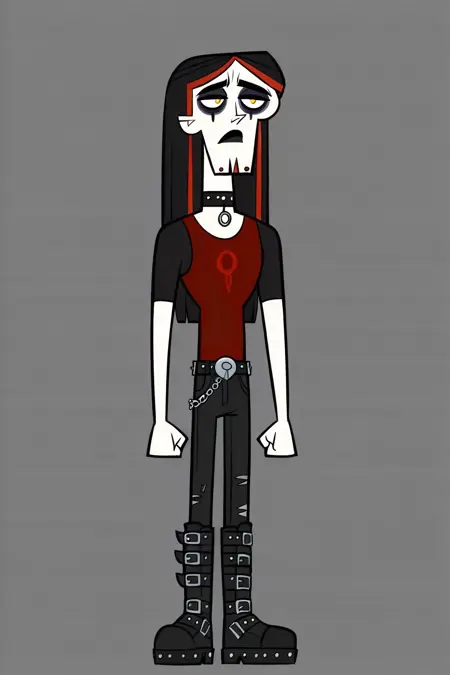 EnnuiTDRR, 1boy, long black hair, dark red sleeveless top, black shirt, pale skin, dark eye makeup, black pants, belt, large black boots with metallic accents, black choker, yellow eyes, red stubble, black lips, lipstick, makeup, goth, ennui (tdi),