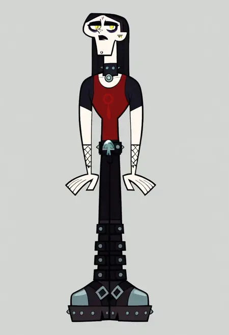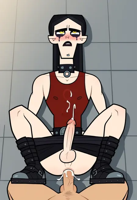EnnuiTDRR, 1boy, long black hair, dark red sleeveless top, black shirt, pale skin, dark eye makeup, black pants, belt, large black boots with metallic accents, black choker, yellow eyes, red stubble, black lips, lipstick, makeup, goth