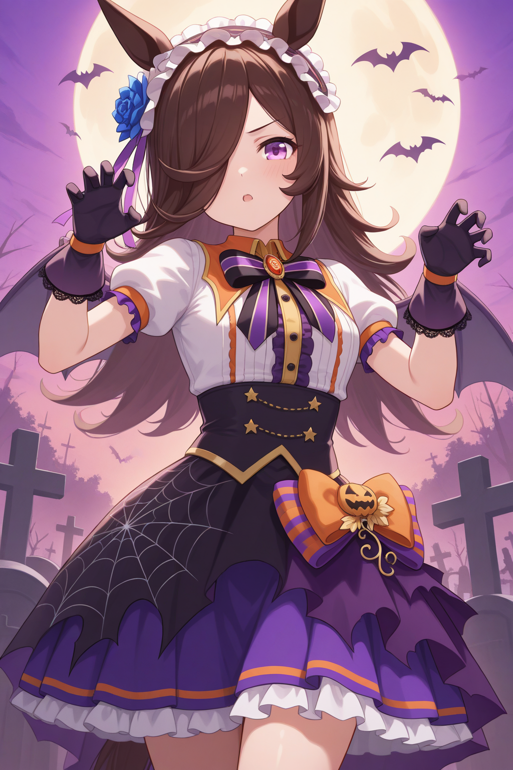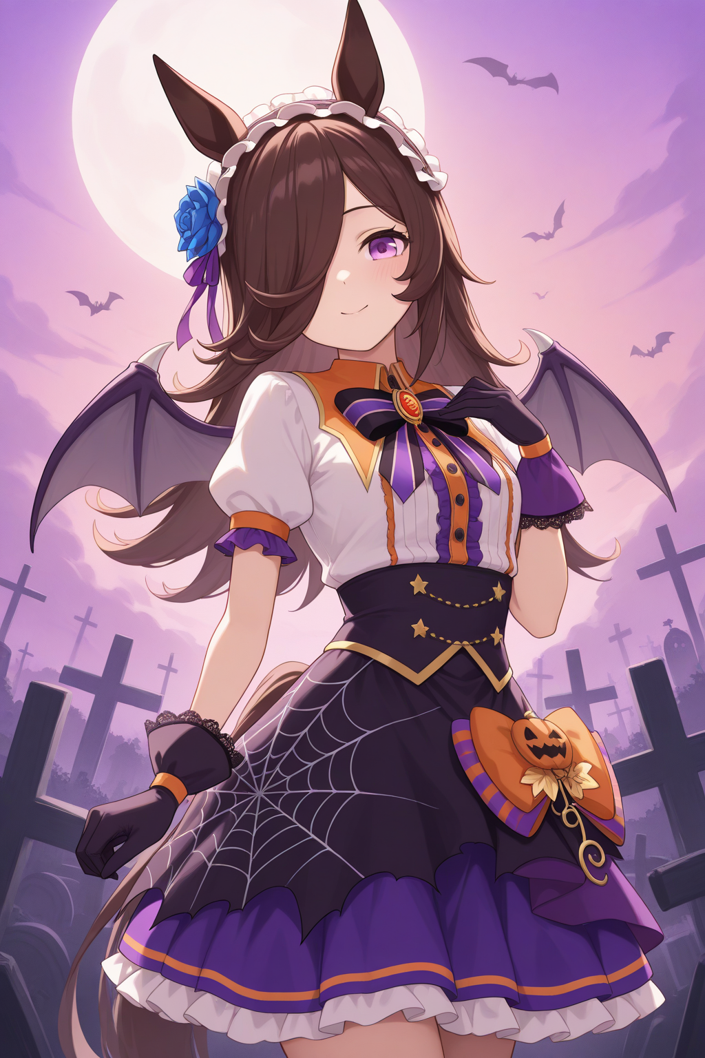 ccrice, animal ears, horse tail, purple eyes, brown hair, hair over one eye, halloween costume, bat wings, frilled hairband, hair flower, blue flower, white shirt, center frills, black bow, striped bow, brooch, puffy short sleeves, purple skirt, high-waist skirt, frilled skirt, spider web print, orange bow, black gloves, lace-trimmed gloves,