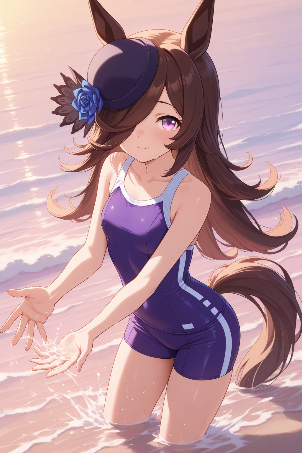 ddrice, animal ears, horse tail, purple eyes, brown hair, hair over one eye, blue headwear, hat flower, tilted headwear, tracen swimsuit, competition school swimsuit, single vertical stripe,