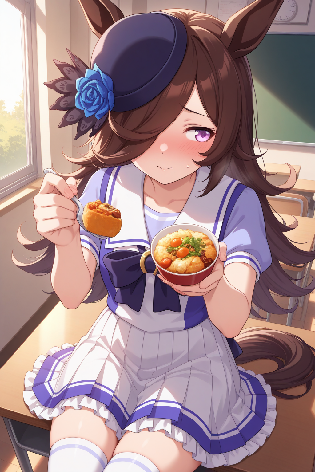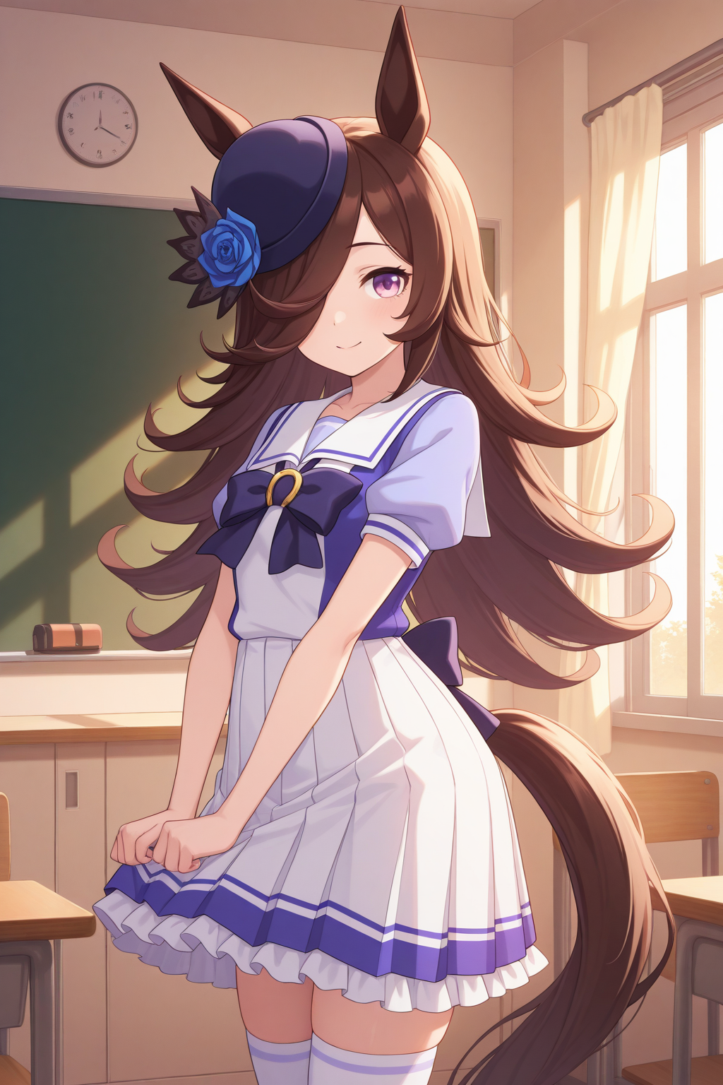 ddrice, animal ears, horse tail, purple eyes, brown hair, hair over one eye, blue headwear, hat flower, tilted headwear, tracen school uniform, purple shirt, sailor shirt, sailor collar, purple bow, horseshoe ornament, puffy short sleeves, white skirt, pleated skirt, frilled skirt,white thighhighs,