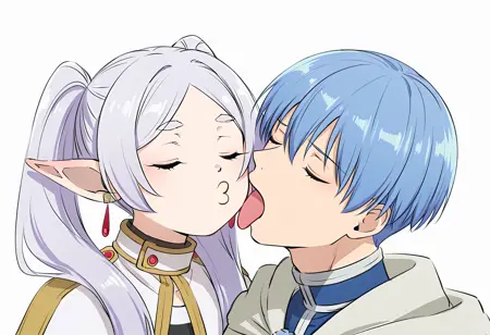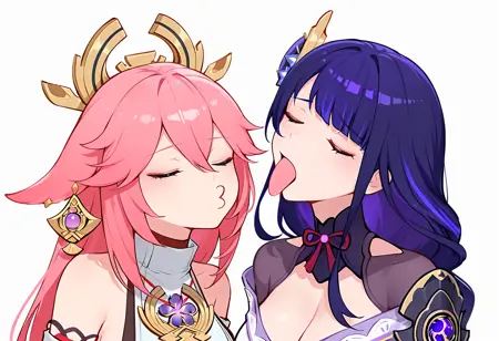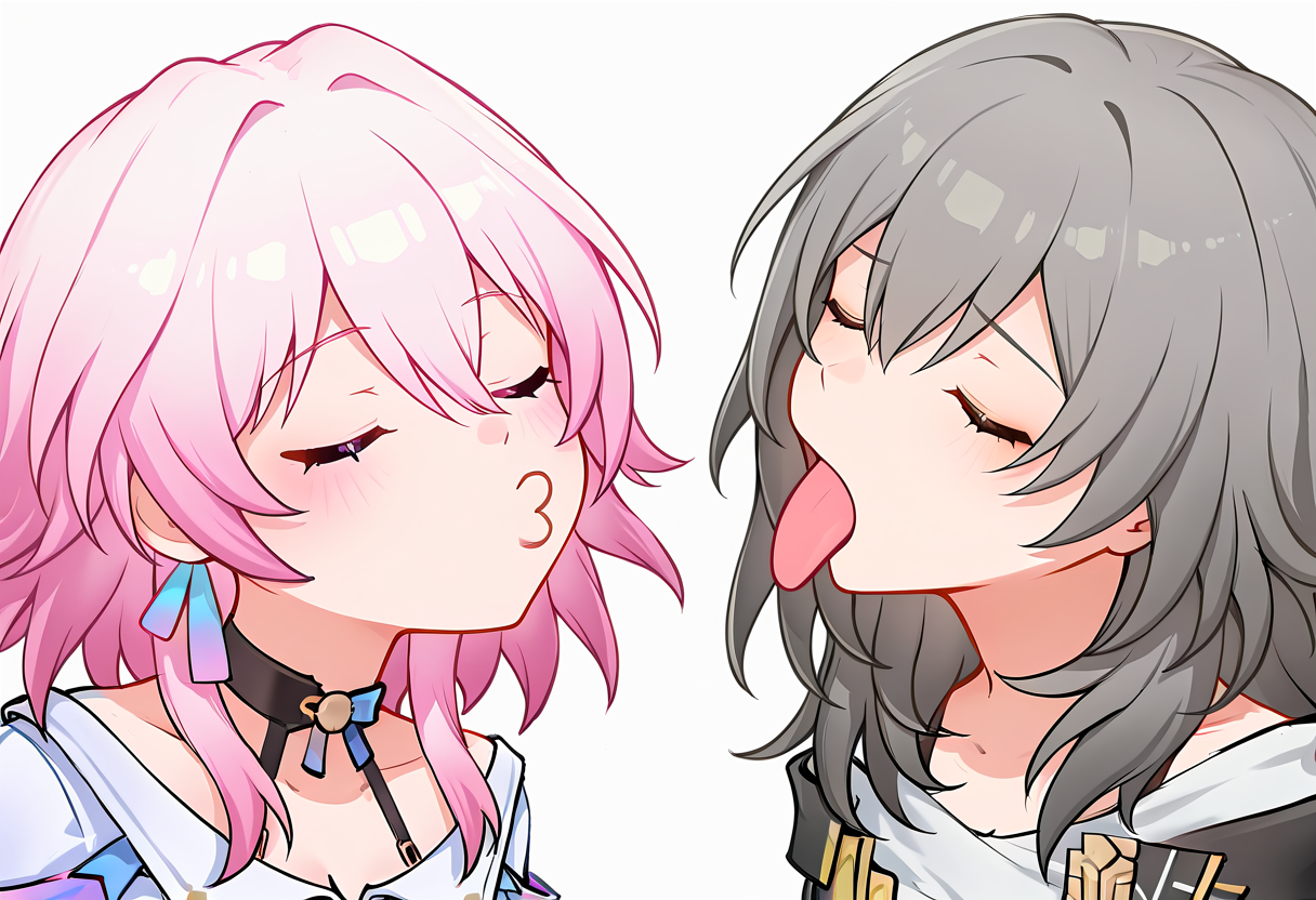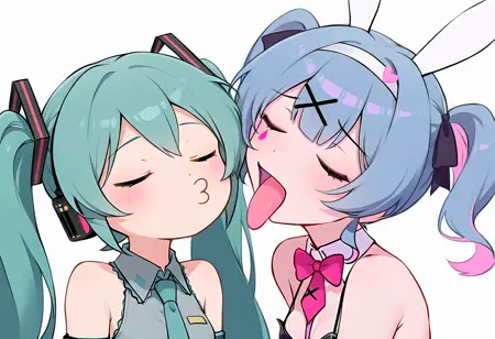 触发词:上半身、闭眼、<角色1>、嘟嘴、o3o、<角色2>、舌头、伸出舌头,