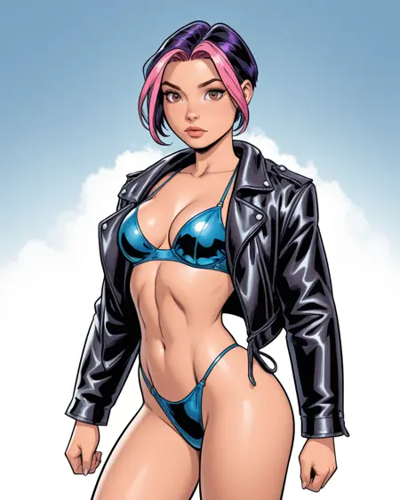 Triggers: roxyfreefall, short hair, purple hair, two-tone hair, pink hair, brown eyes, jacket, bodysuit,