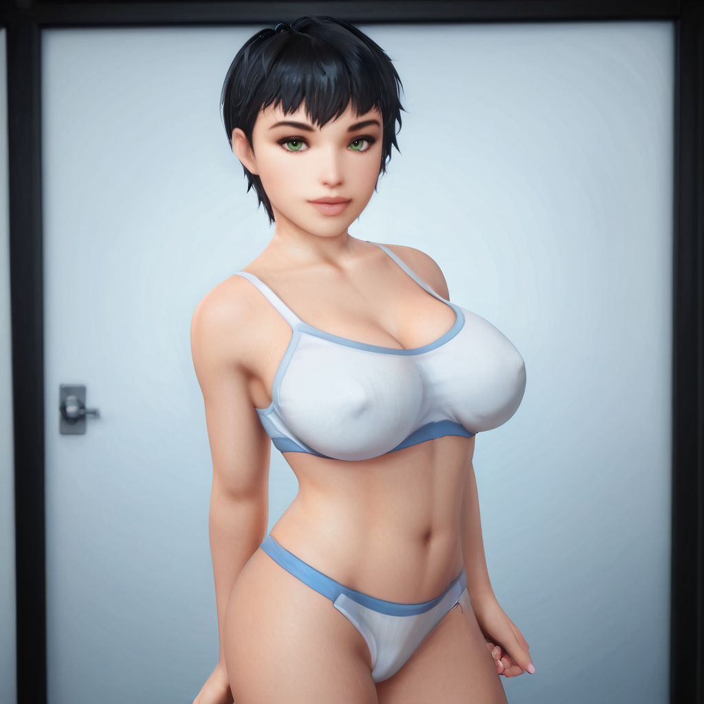 Trigger with casual clothes: CatwomanArkhamCity, 1girl, solo, black hair, large breasts, green eyes, short hair, curvy, cowboy shot, sweater, jeans