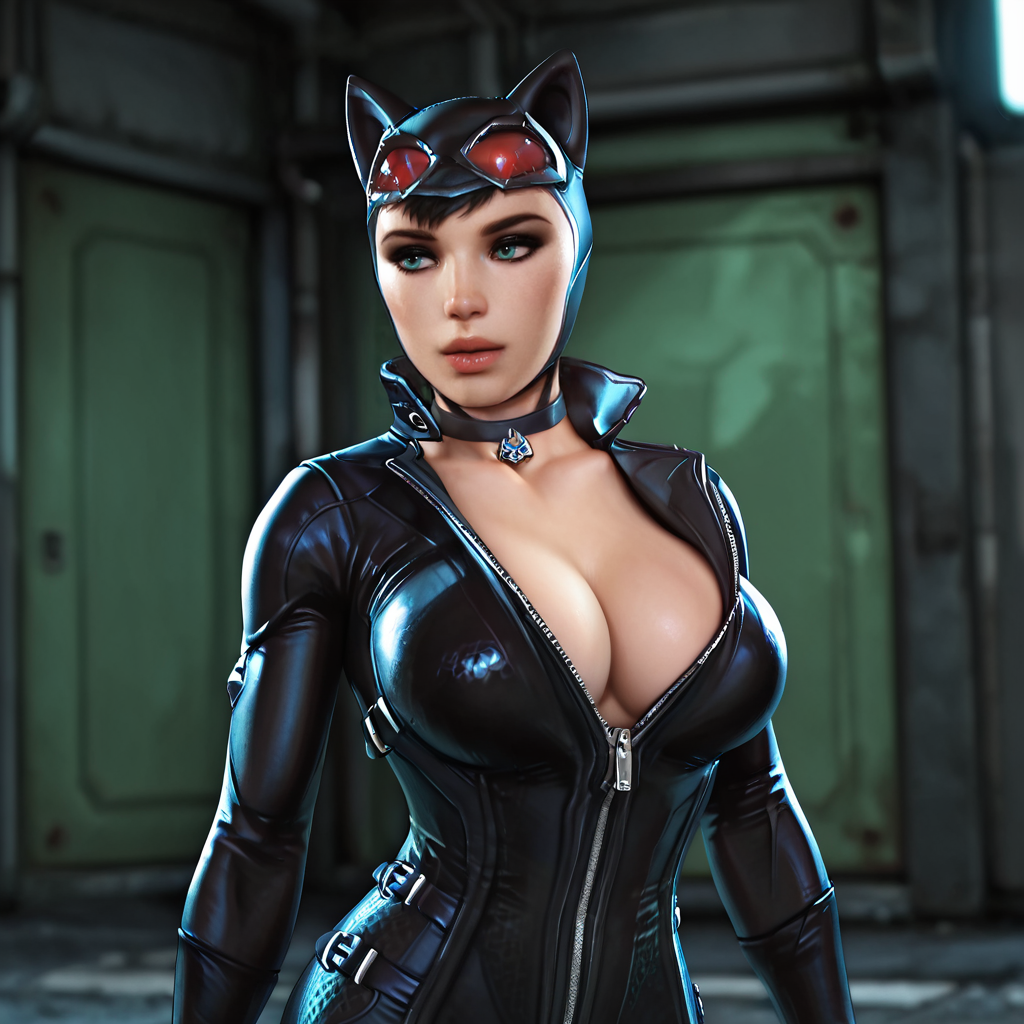 Trigger : CatwomanArkhamCity, 1girl, large breasts, bodysuit, animal ears, cleavage, choker, zipper, mask, lips, unzipped, gloves, cowboy shot