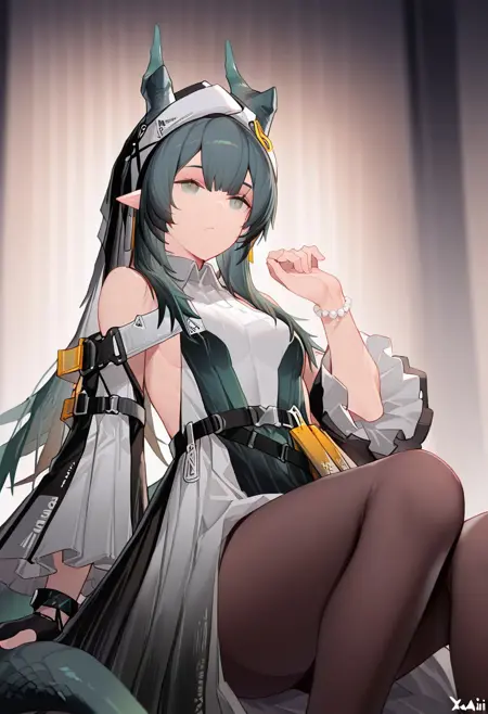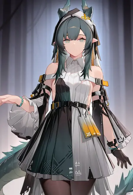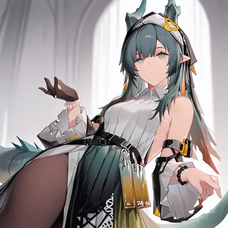 | 학습된 단어 | xaihi, bare_shoulders, sideboob, small_breasts, multicolored_dress, black_dress, green_dress, white_dress, belt_pouch, frilled_sleeves, frills, long_sleeves, wide_sleeves, single_glove, black_gloves, pearl_bracelet, bracelet, dragon_tail, green_tail, pantyhose, 복사됨! |
