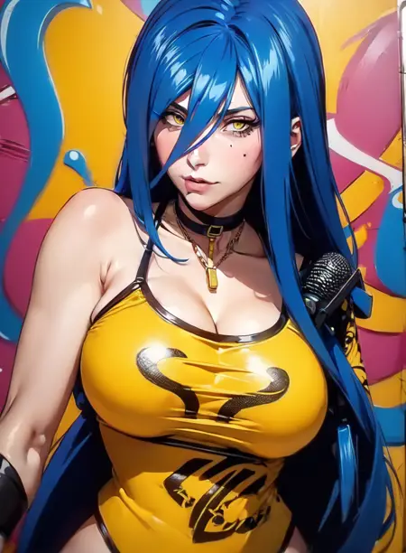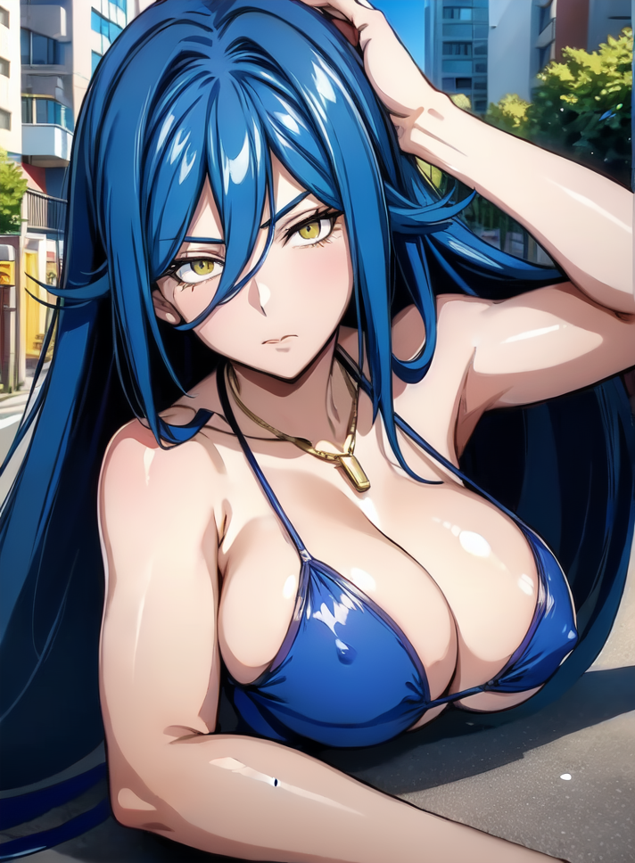 외모: 1소녀, 노란 눈, 큰 가슴, 긴 머리, 파란 머리, 눈 사이의 머리, 목걸이