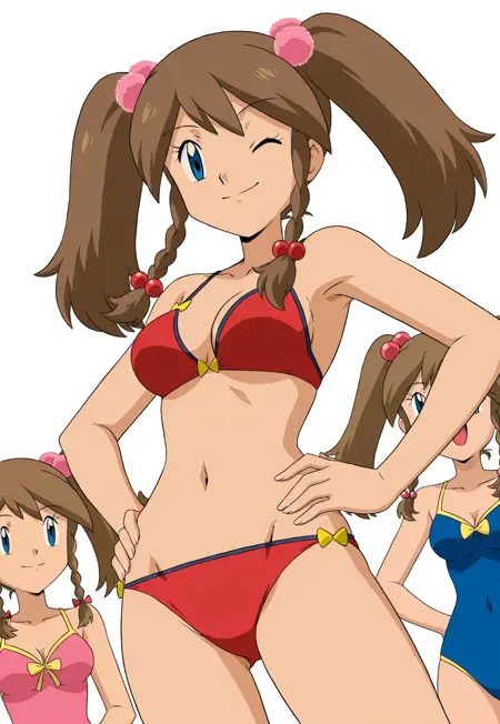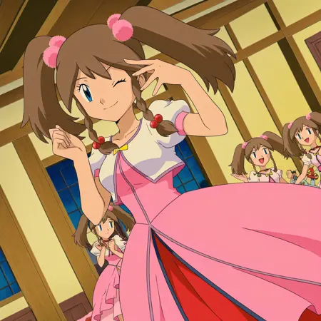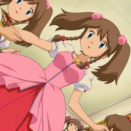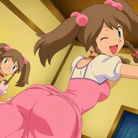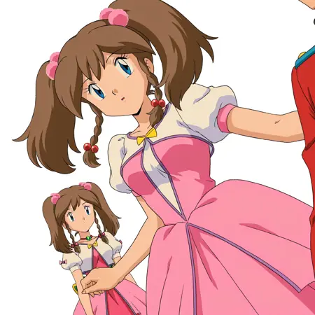 这是一个来自路卡利欧电影中五月的模型。使用标签如 "pokemon may, haruka, brown hair, twintails, braid, blue eyes, twin braids, hair ornament, dress"