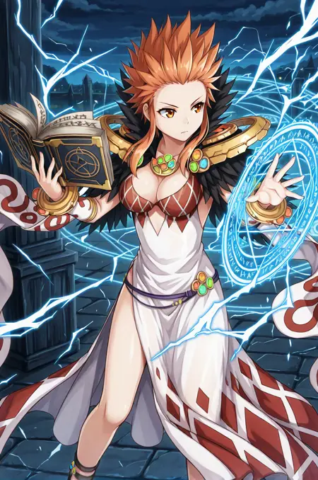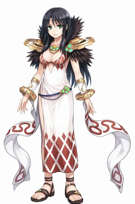 プロンプト:sorRO、ブレスレット、白いアーグル柄のドレス、黒い羽のフリンジ、ネックレス、バングル、アンクレット、黒い毛皮のカラー、広い袖、肩のアーマー、衣装のカットアウト、アームウォーマー、サイドスリット、サンダル