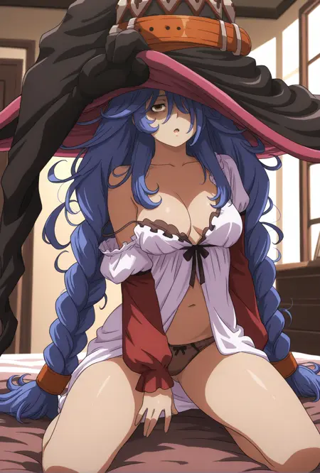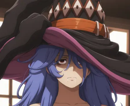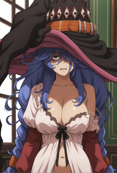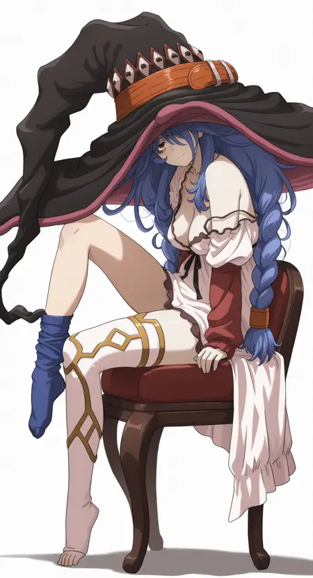 外見タグ: 11thBlackScripture, blue_hair, twin_braids, (loose_hair_strand), hair_tubes, messy_hair, sidelocks, long_hair, brown_eyes, hair_over_one_eye, bags_under_eyes