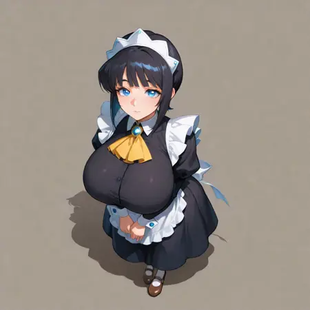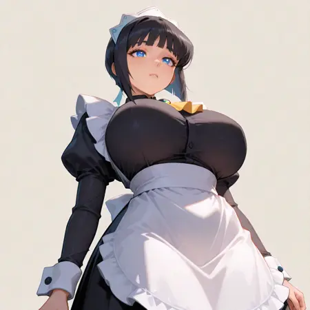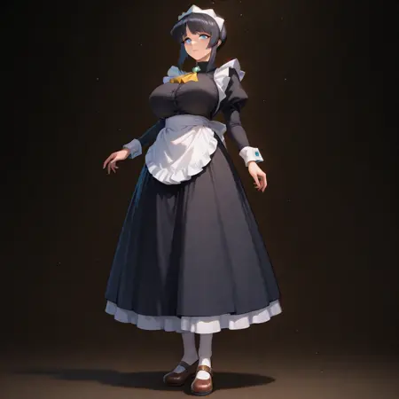 메이드, 메이드 헤드어새스, 메이드 앞치마, 허리 앞치마, 노랑 스카프, 검은 셔츠, 긴 소매, 풍성한 소매, 긴 치마, 검은 치마, 손목 커프스, 메리 제인, 갈색 신발,