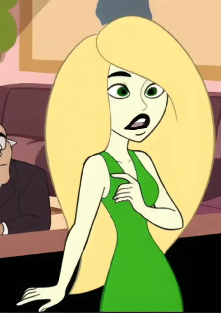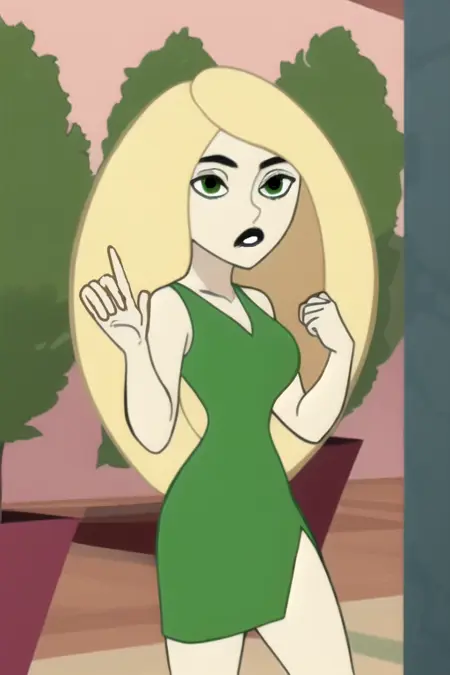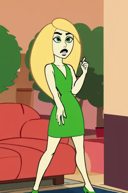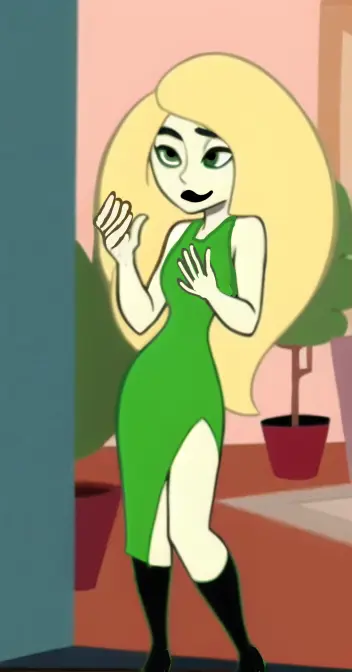 solo, 1 girl, long hair, black lips, blonde hair, green eyes, light green dress with neckline, arms and legs bare around neck, long black shoes.