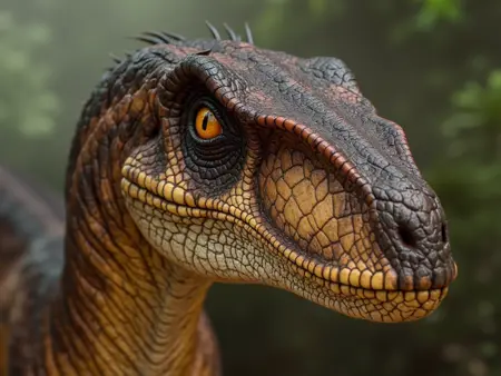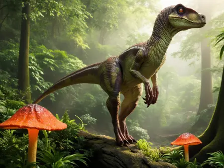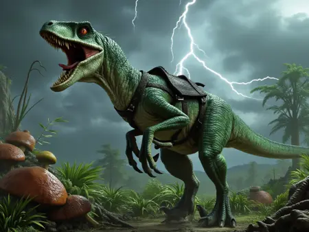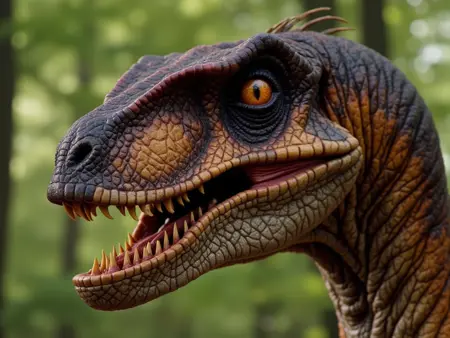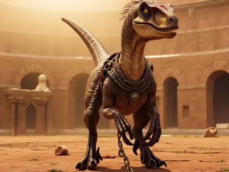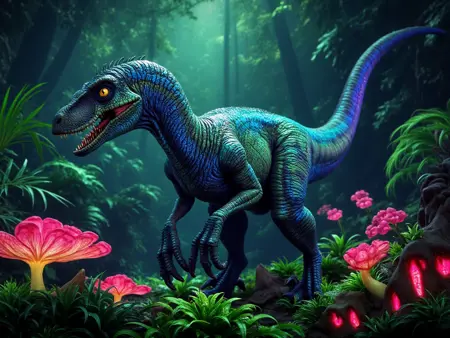 JPVelociraptor 在丛林废墟中, cinematic lightingJPVelociraptor 穿着部落盔甲,站在竞技场中,角斗士风格JPVelociraptor 穿着骨甲与羽毛,双眼发出红光JPVelociraptor 脸涂小丑彩绘、佩戴铃铛,在恐怖马戏团帐篷中生物发光的 JPVelociraptor,尾巴发光,周围是外星植被