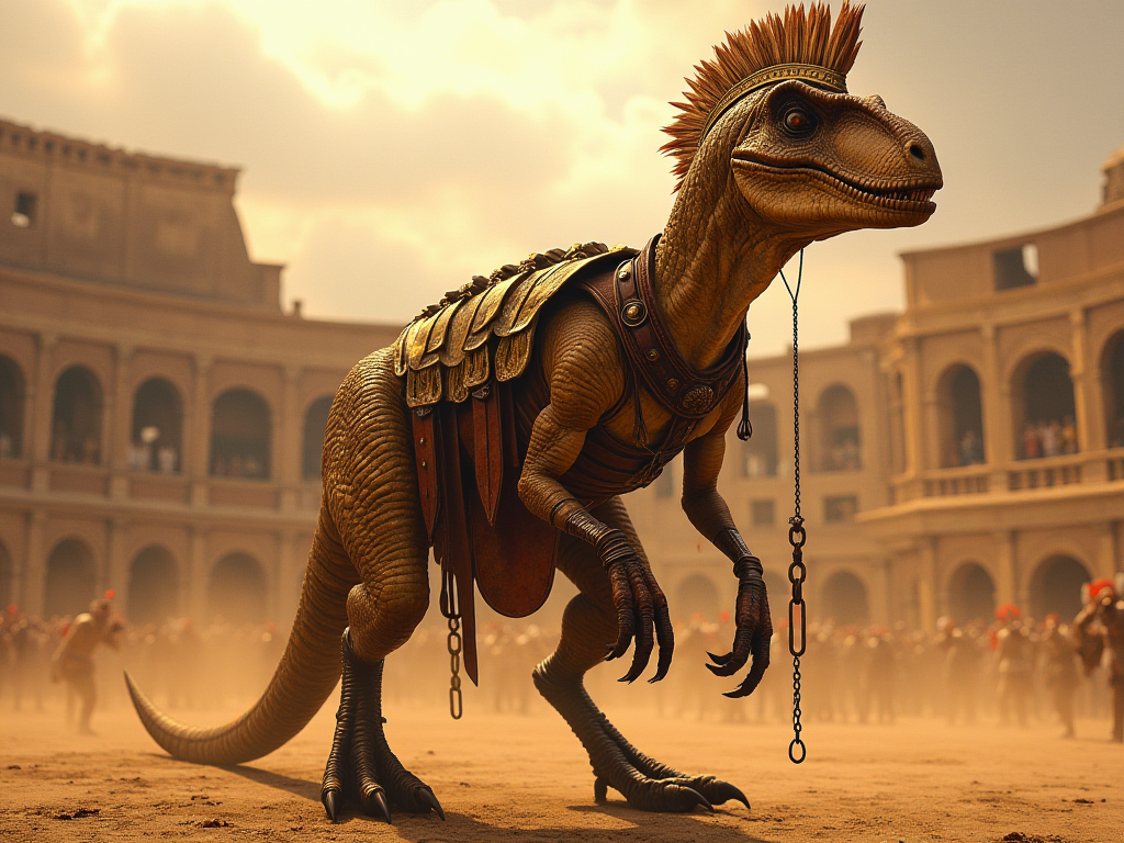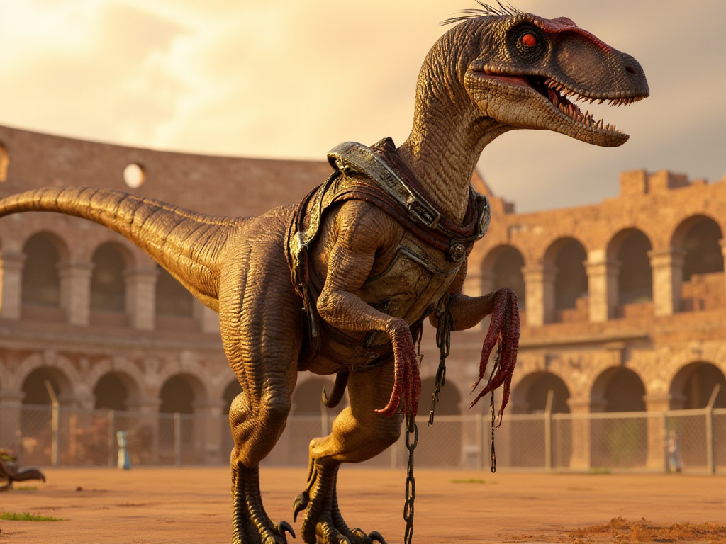 • JPVelociraptor with tribal armor, standing in an arena, gladiator style