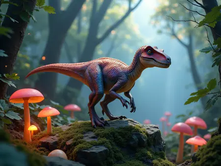 • bioluminescent JPVelociraptor with glowing tail and alien foliage