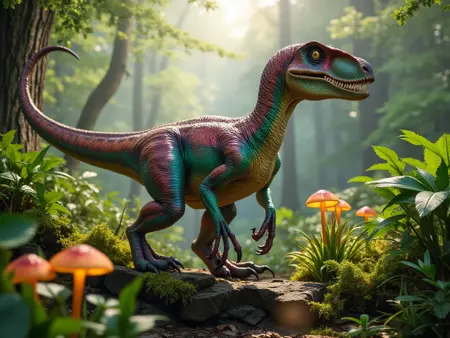 • 生物发光的 JPVelociraptor,尾巴发光,周围是外星植被
