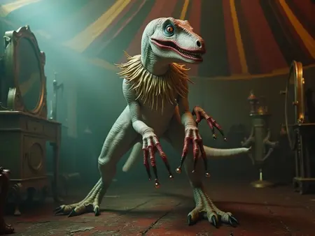 • JPVelociraptor 脸涂小丑彩绘、佩戴铃铛,在恐怖马戏团帐篷中