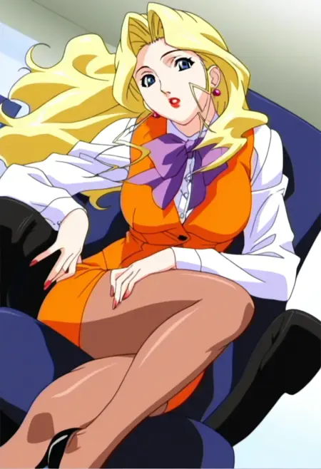 1girl, solo, Alice Nonoyama, mature female, long hair, blue eyes, blonde hair, jewelry, earrings, makeup, lipstick, bangs, bangs tucked behind the ears, middle parted long wavy bangs, thin curly side hair, wavy hair, office lady, white shirt, orange waistcoat, orange pencil skirt, purple bow tie ribbon, neck ribbon, brown pantyhose, black high heels,