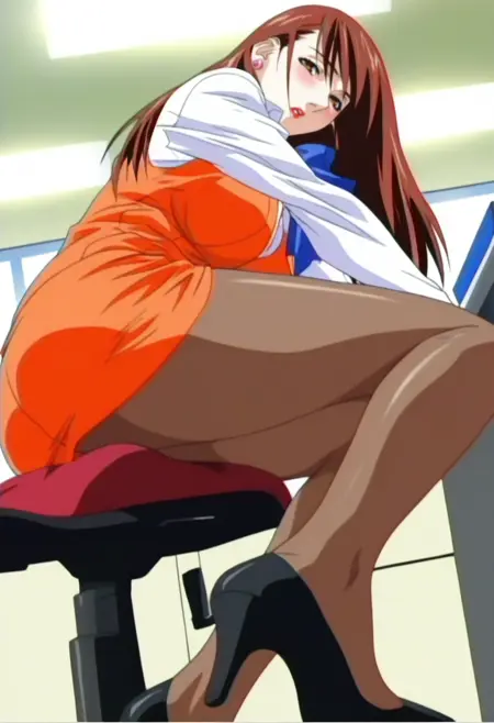 1girl, solo, Rena Asaoka, solo, mature female, long hair, brown hair, makeup, lipstick, sharped straight bangs, bangs, light brown eyes, jewelry, earrings, necklace, pendant, office lady, white open shirt, big breasts, wide hips, office lady, white shirt, orange waistcoat, orange pencil skirt, blue bow tie ribbon, neck ribbon, brown pantyhose, black high heels,