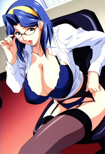 1girl, solo, Chisa Sakurai, solo, mature female, medium hair, short hair, blue hair, yellow hairband, glasses, makeup, lipstick, medium parted bangs, bangs tucked behind the ears, jewelry, earrings, huge breasts, wide hips, office lady, white shirt, orange waistcoat, orange pencil skirt, yellow bow tie ribbon, neck ribbon, brown pantyhose, black high heels,