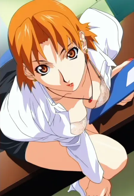 1girl, solo, Mayumi Fujiyama, young female, short hair, orange hair, short parted bangs, makeup, lipstick, bangs, orange eyes, jewelry, earrings, necklace, pendant, office lady, office lady, white shirt, orange waistcoat, orange pencil skirt, pink bow tie ribbon, neck ribbon, white high heels,