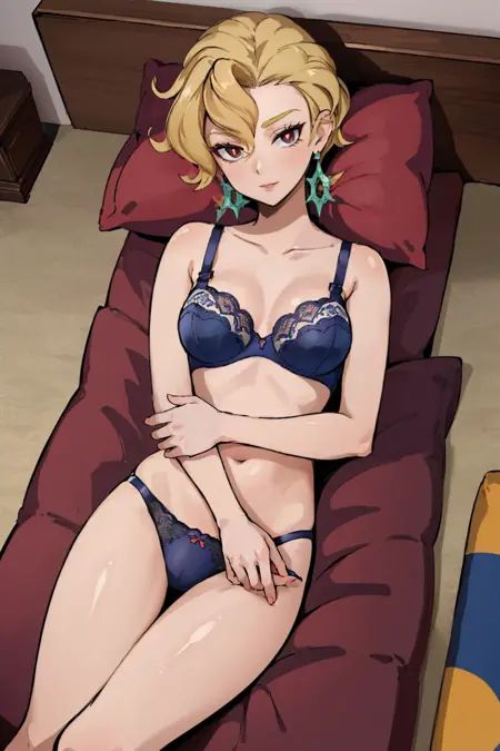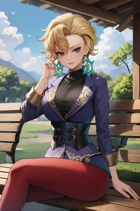 Default Outfit: purple jacket, black sweater, turtleneck, red pants, earrings