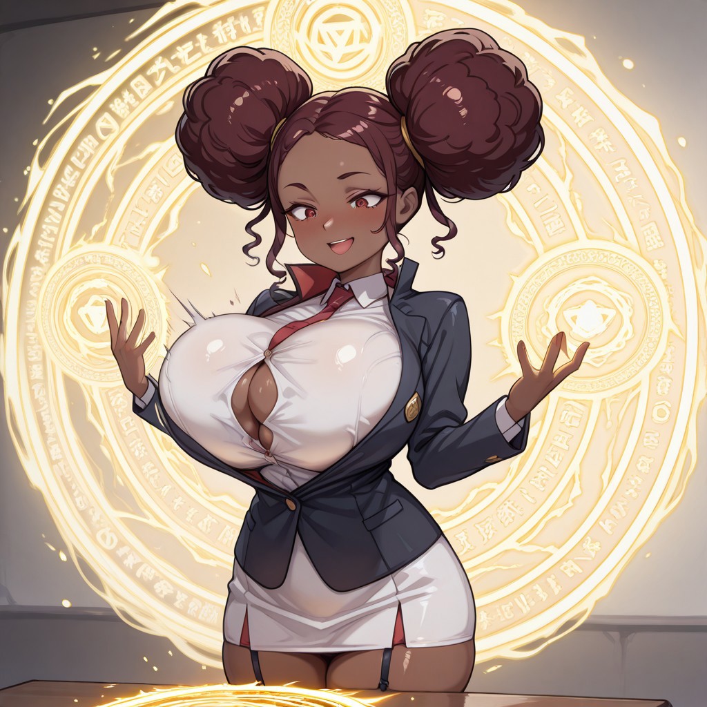 ((dark-skinned girl)), huge breasts, school uniform, fringe, necktie, blazer, corset, red eyes