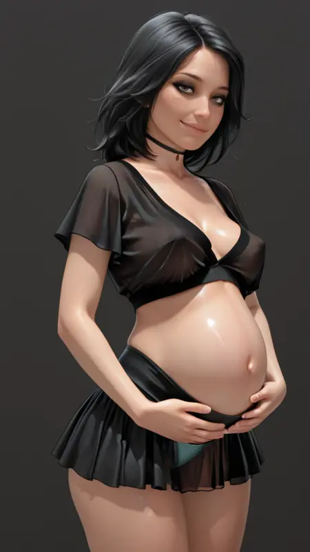 妊娠中、妊娠したお腹、黒いバンドチョーカー、黒いブラウス、透け感のあるブラウス、カットトップ、深く開いた襟、胸の露出、短い袖、黒いマイクロスカート、透け感のあるマイクロスカート、スカートの下にパンツ