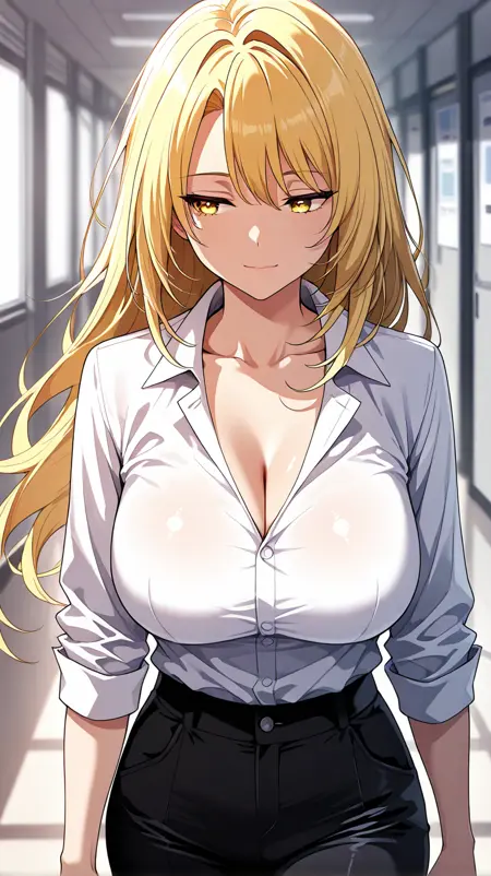 luna_casual_outfit, 锁骨, 胸部暴露, 白色衬衫, 黑色裤子,
