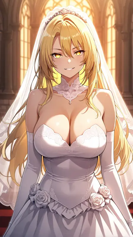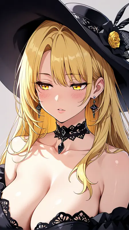 1girl, solo, il_luna, 黄色眼睛, 长发, 金发, 刘海, 头发遮住眼睛, 大胸, (成熟:1.2),