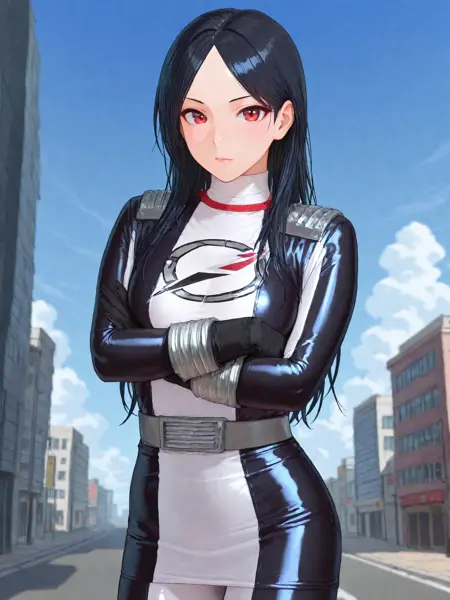 b0uk3ng3r, [color] bodysuit, [color] gloves, [color] skirt, miniskirt, shoulder pads, silver belt
