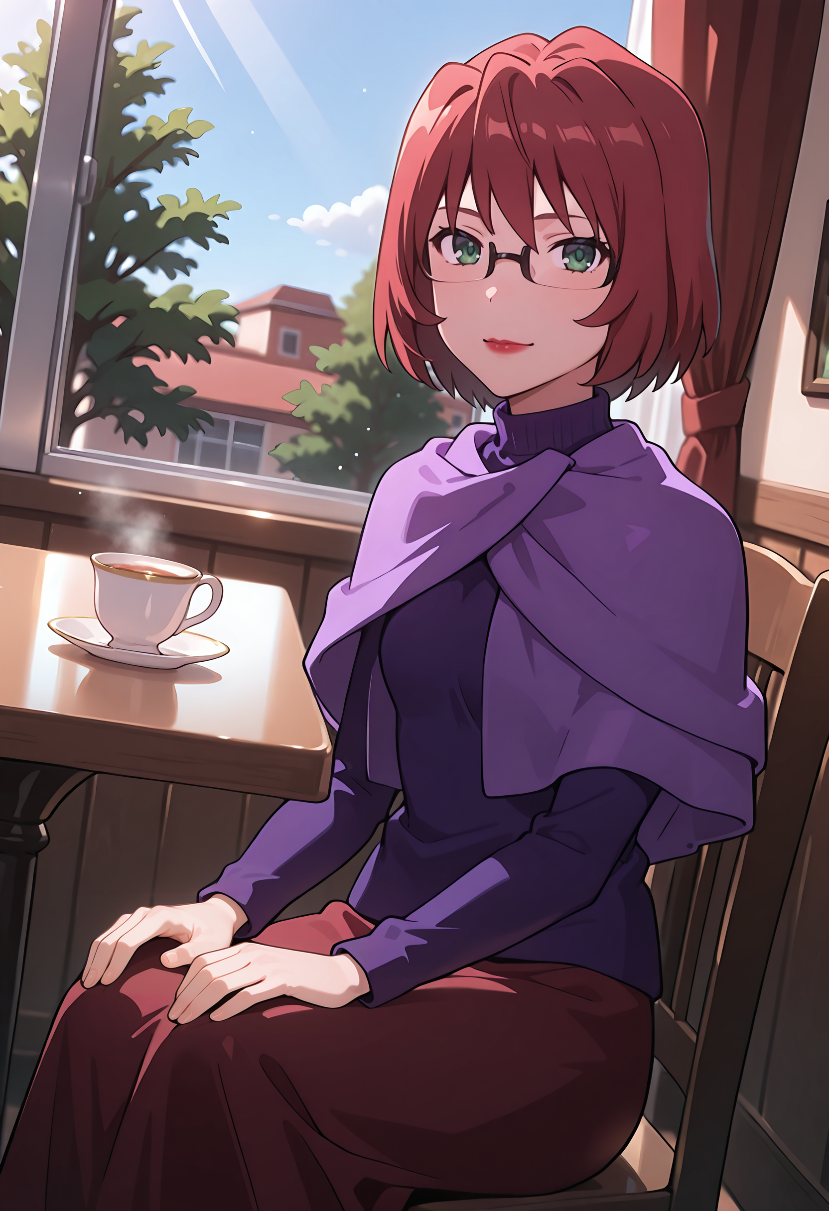 ToradoraYuu、濃い緑色の目、赤髪、短髪、ふわふわの前髪、眼鏡、半フレーム眼鏡、赤いリップ — この特徴を強調したい場合は「成熟した女性」を追加してください