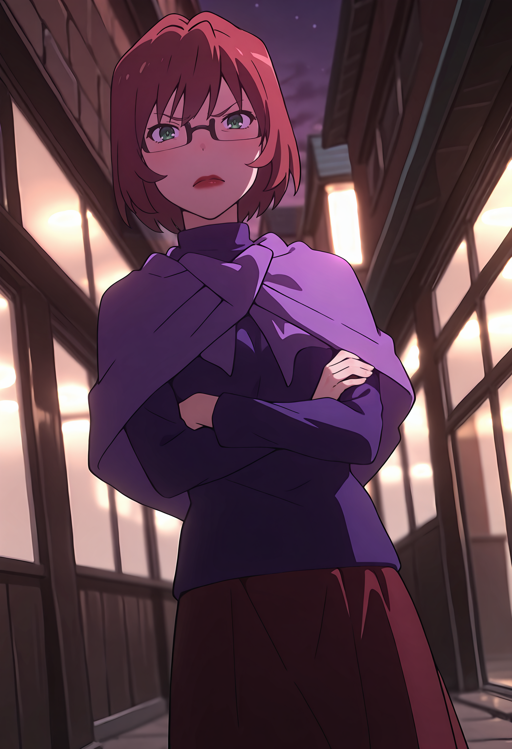 #1: 紫色のセーター、カーディガン、赤スカート、ロングスカート、レッグウォーマー、黒ハイヒール
