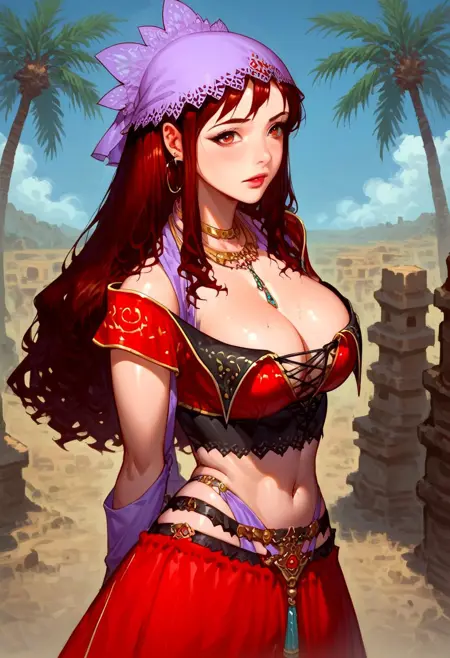 빨간 눈, 긴 머리, 빨간 머리, 큰 가슴, 크롭탑, 코르셋, 목걸이, 보석, 보라색 머리장식, 빨간 치마, 복부, 가슴선,