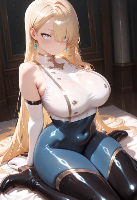 wilhelmina from brown dust, blonde hair, blue eyes, elbow gloves, hair over one eye, 1girl, solo, looking at viewer