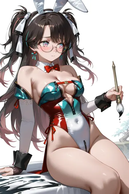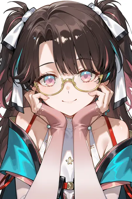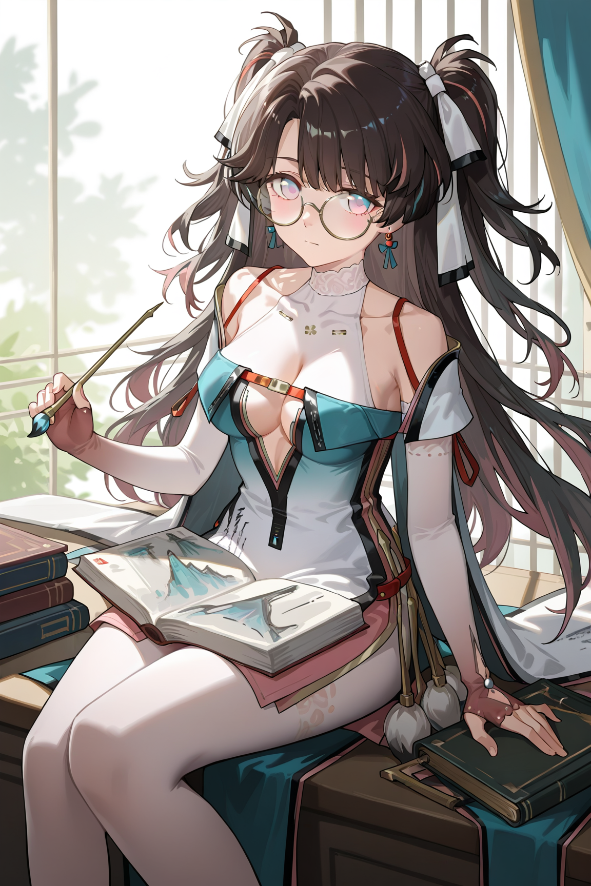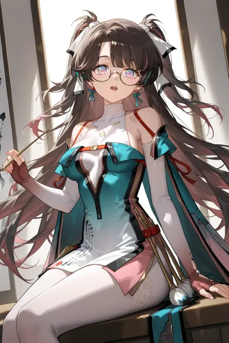 zhezhi \(wuthering waves\), 1girl, glasses, solo, jewelry, long hair, white bow, thighhighs, dress, earrings, white thighhighs, white pantyhose, twintails, pantyhose, chinese clothes,