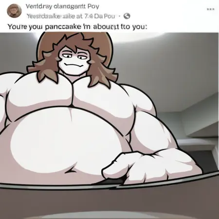 pov_you_re_a_pancake_meme, upper body, English text, buff, muscular, belly, holding pan, looking at viewer