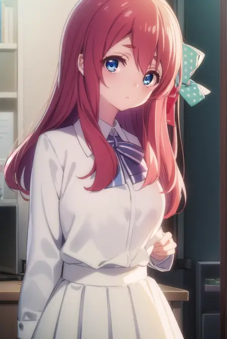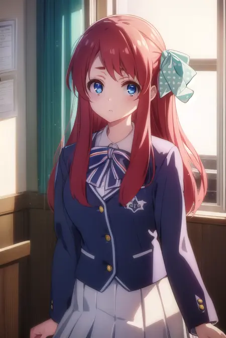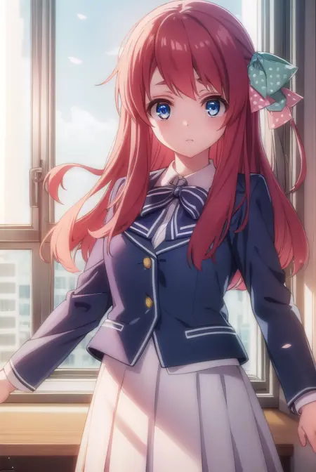 sakura minamoto,蓝眼睛,长发,红发,一侧束起,发带,绿色蝴蝶结,红色蝴蝶结,呆毛,波点,波点蝴蝶结,