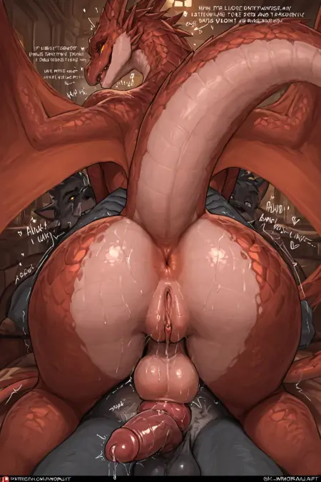 Mr. Mordaut, red scales, amber eyes, slit pupils, black dragon horns, dragon wings, reptilian tail, claws, sharp teeth