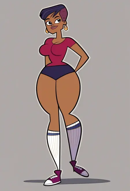 StephanieTDRR, 1girl, dark skinned female, short dark blue hair, red-magenta top, dark blue-purple shorts, knee-high white socks with magenta-pink stripes, gold hoop earrings, black eyes, magenta-pink shoes, lips, big lips